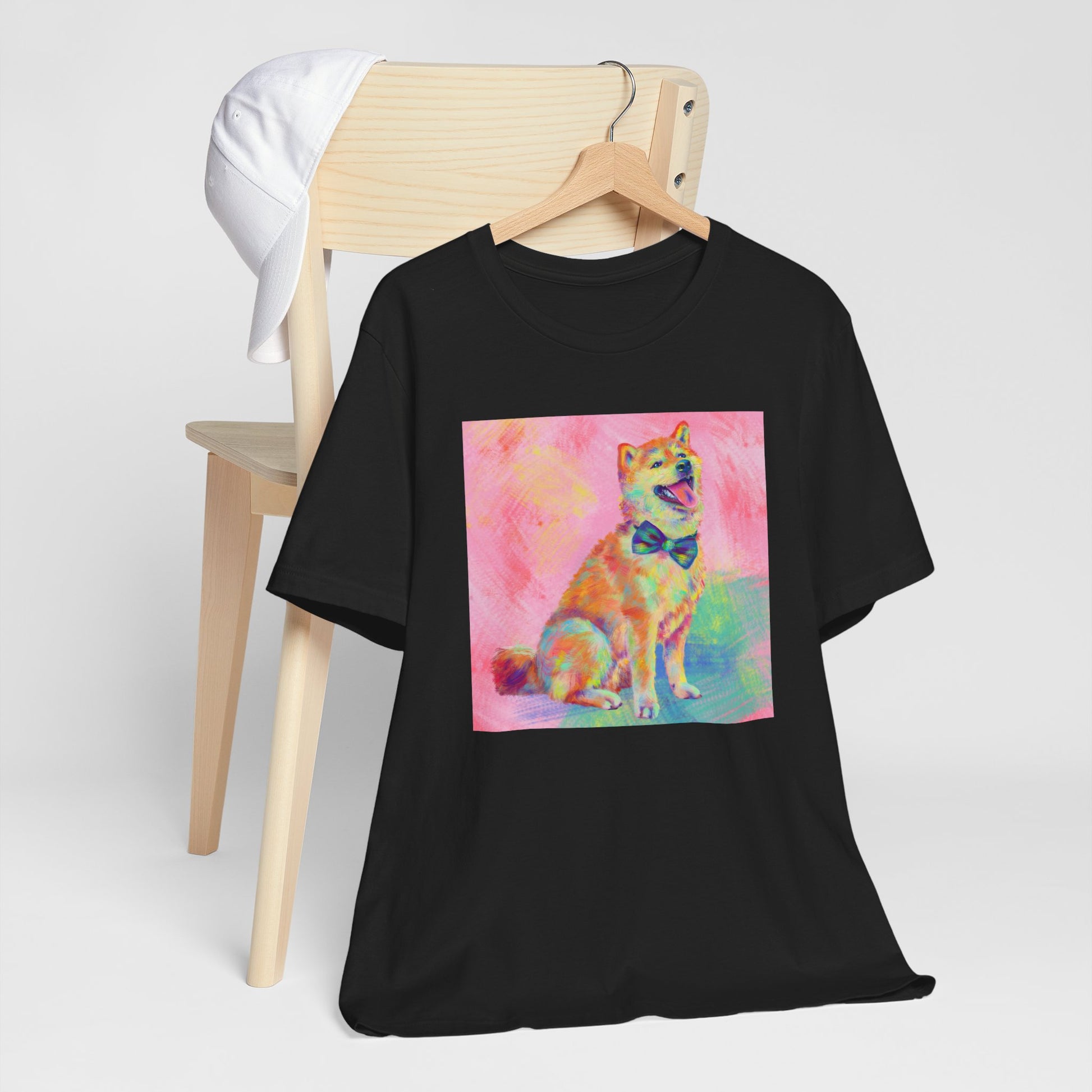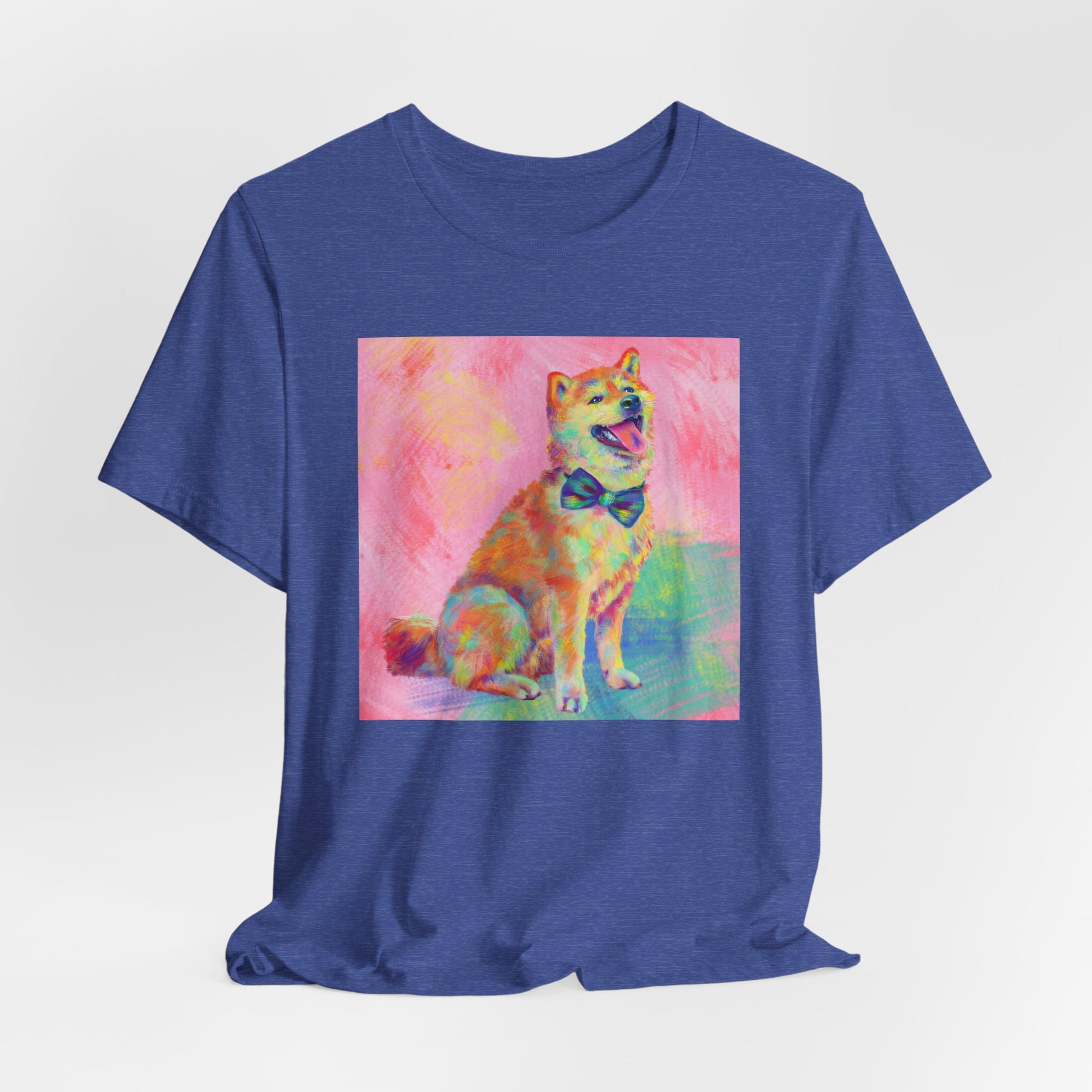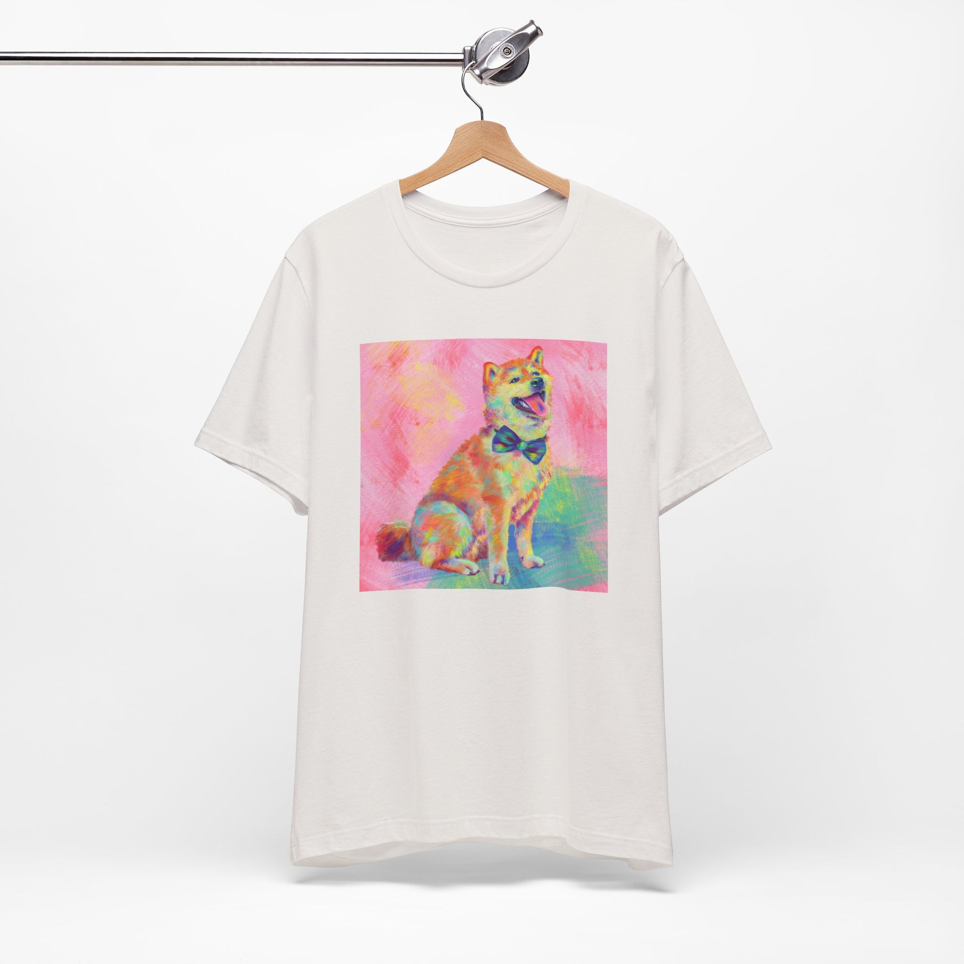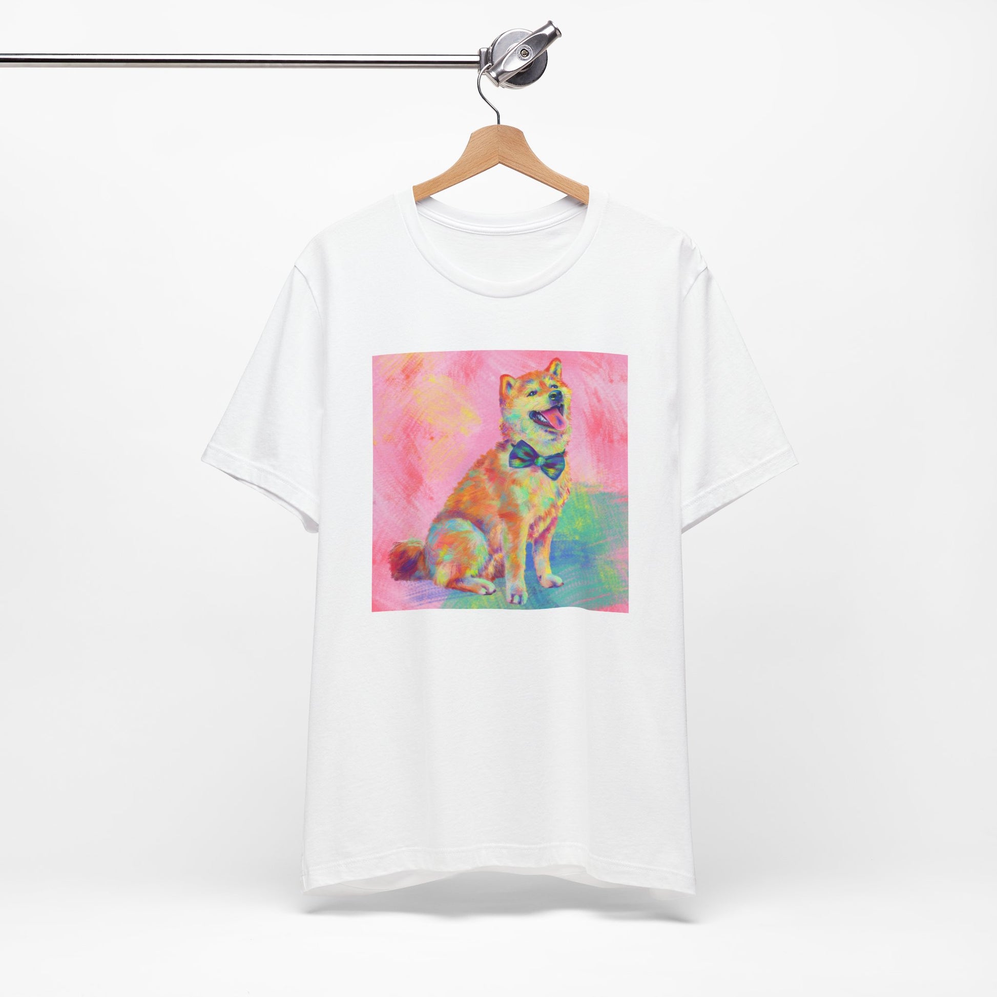 Bring some color to your day with our vibrant Shiba Inu design by Jess Castle! Featuring a hand-painted digital artwork full of neon pastels and retro pop flair, this cheerful Shiba sits proudly with a bow tie and endless good vibes. Printed in full color on a soft, high-quality tee, it’s perfect for dog and Shib lovers, art fans, and anyone who appreciates bold, happy design. A wearable artwork that pairs perfectly with your favorite jeans, streetwear fits, or cozy lounge days.