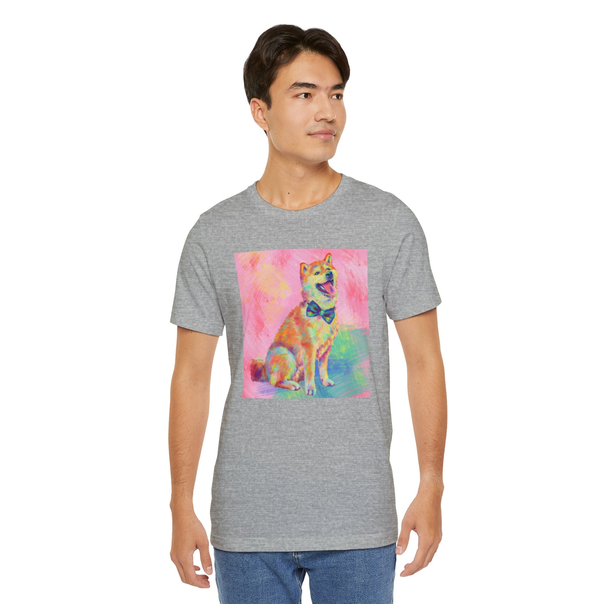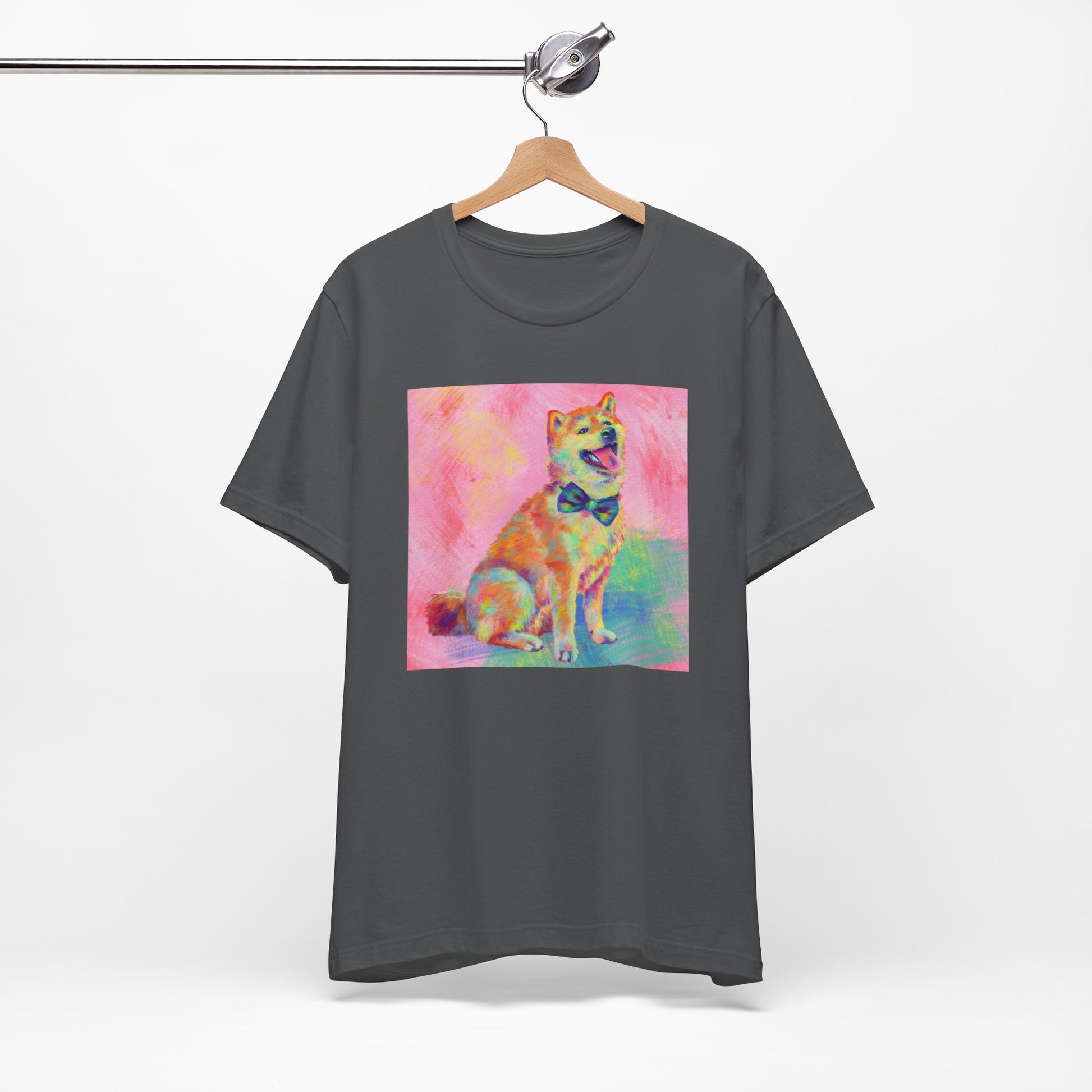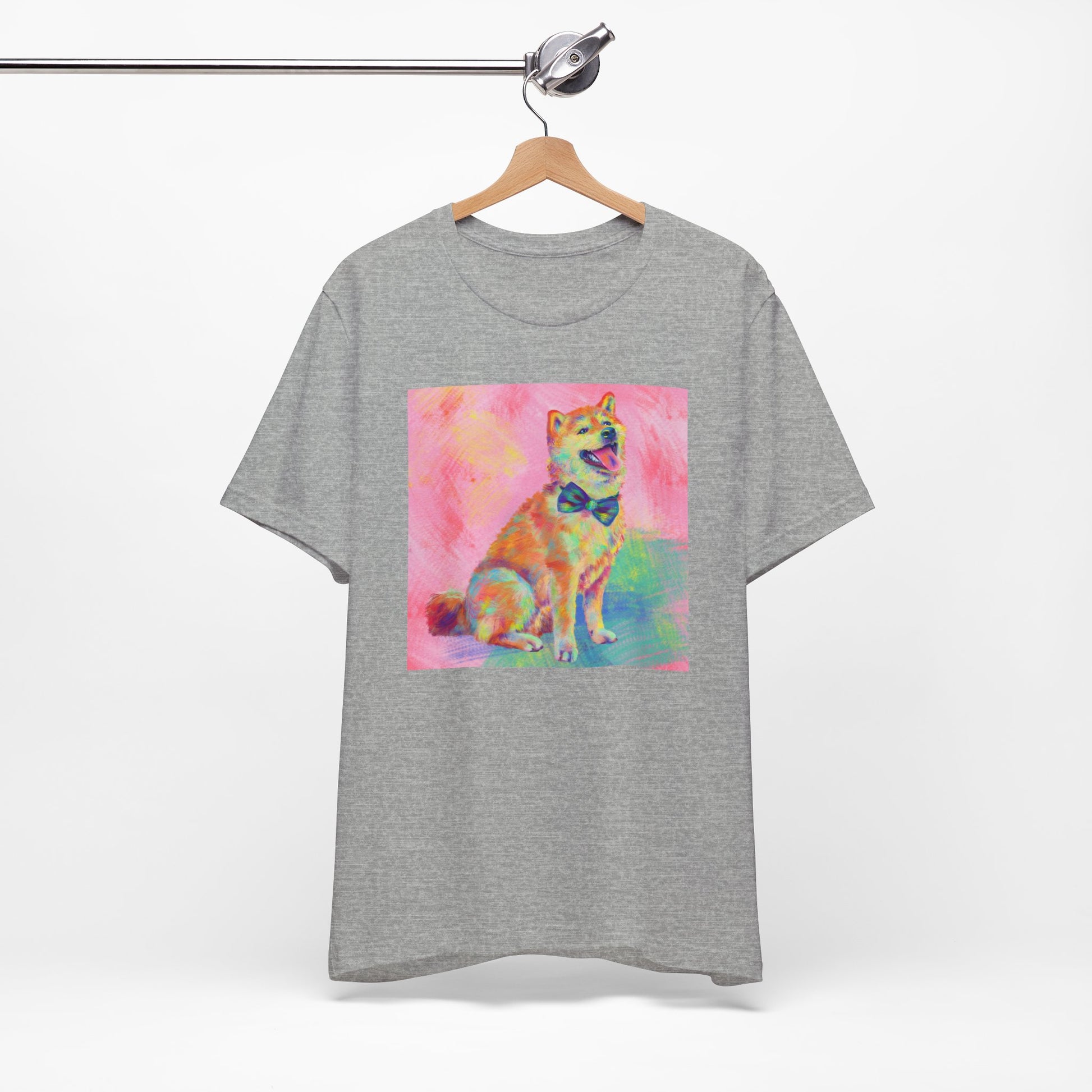 Bring some color to your day with our vibrant Shiba Inu design by Jess Castle! Featuring a hand-painted digital artwork full of neon pastels and retro pop flair, this cheerful Shiba sits proudly with a bow tie and endless good vibes. Printed in full color on a soft, high-quality tee, it’s perfect for dog and Shib lovers, art fans, and anyone who appreciates bold, happy design. A wearable artwork that pairs perfectly with your favorite jeans, streetwear fits, or cozy lounge days.