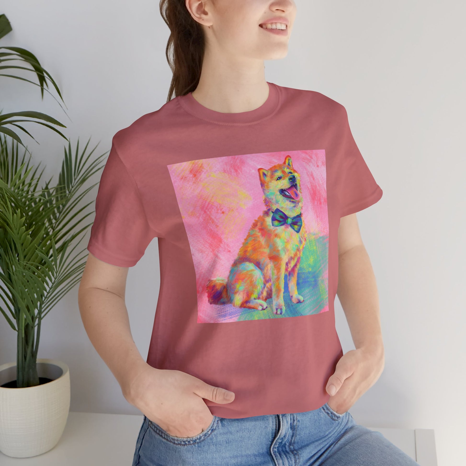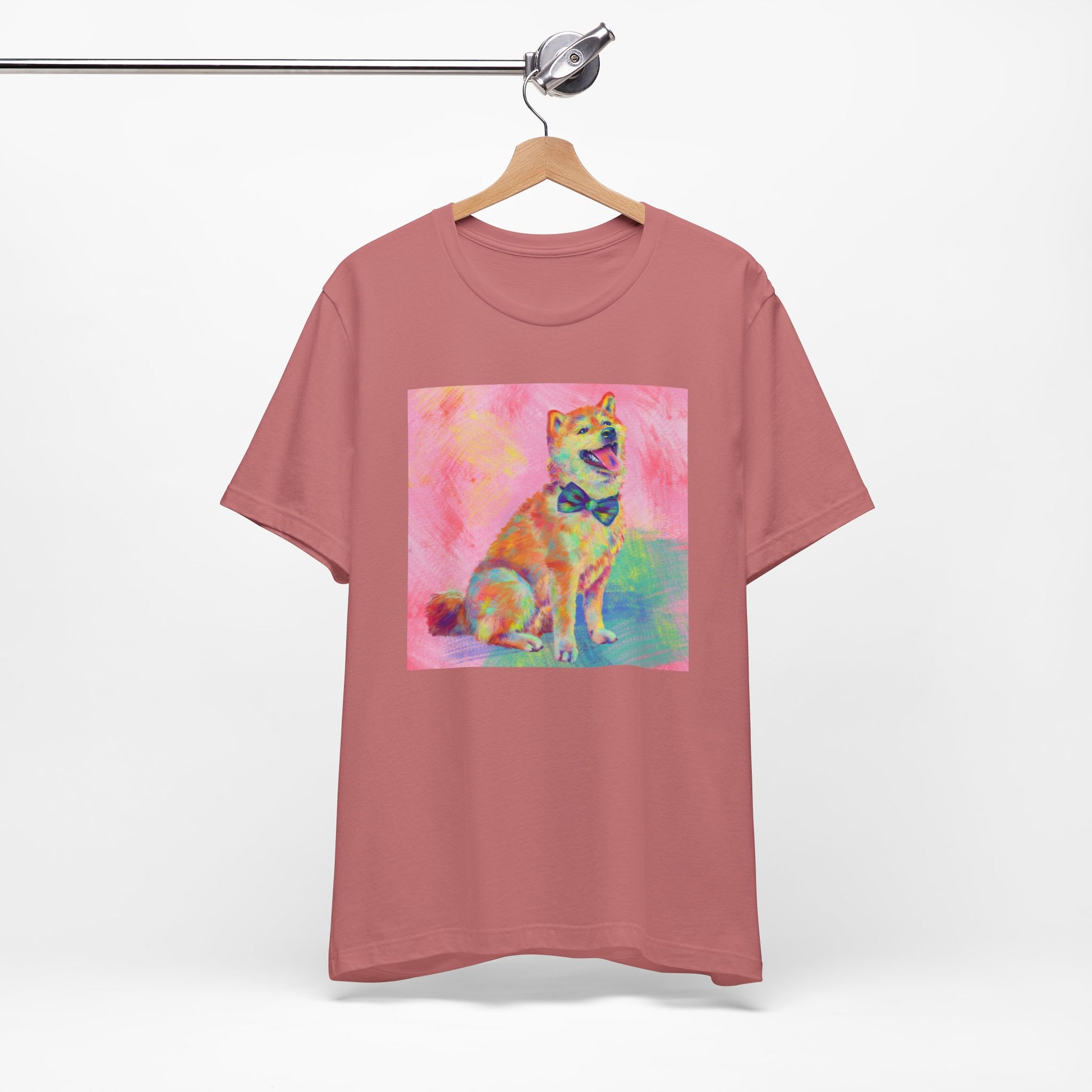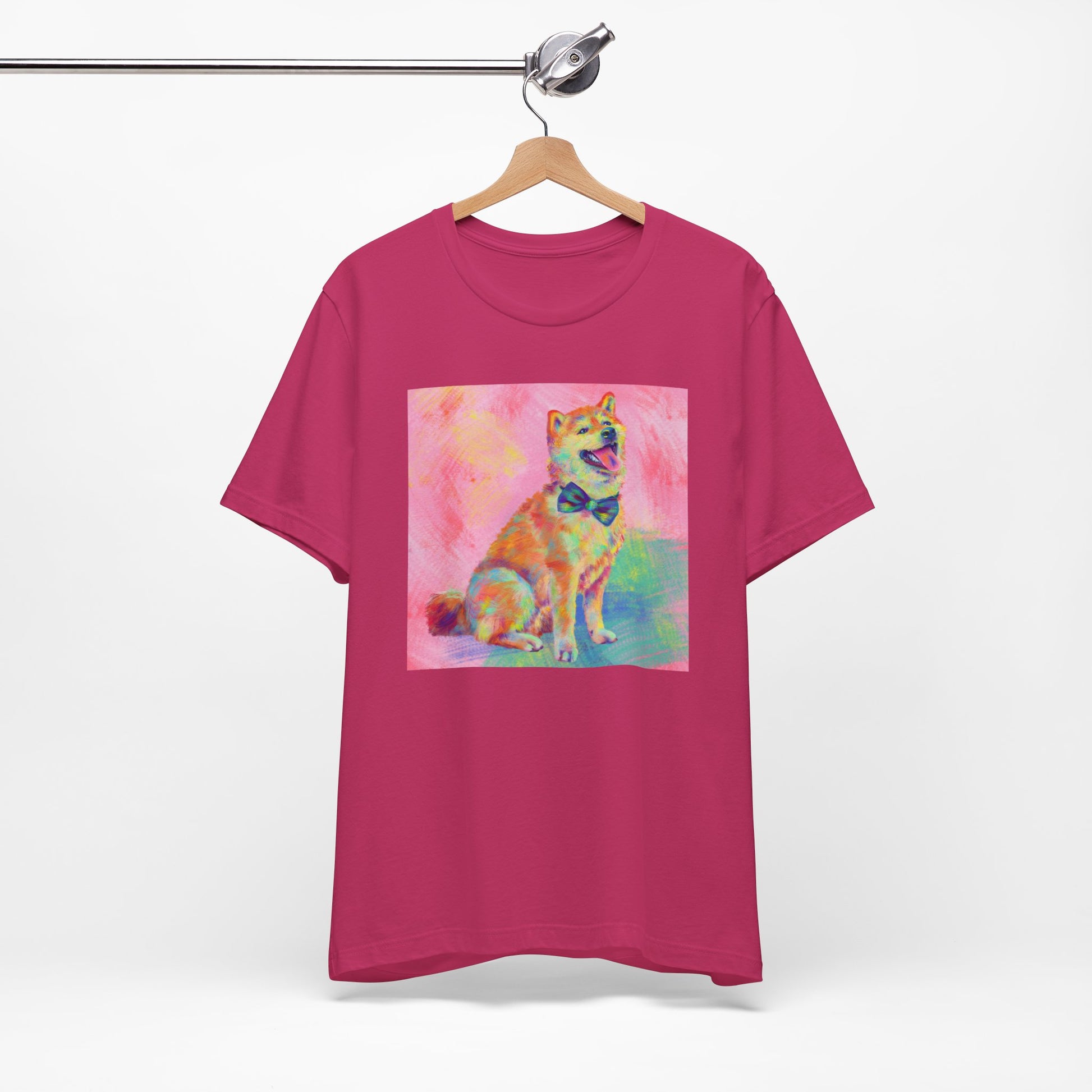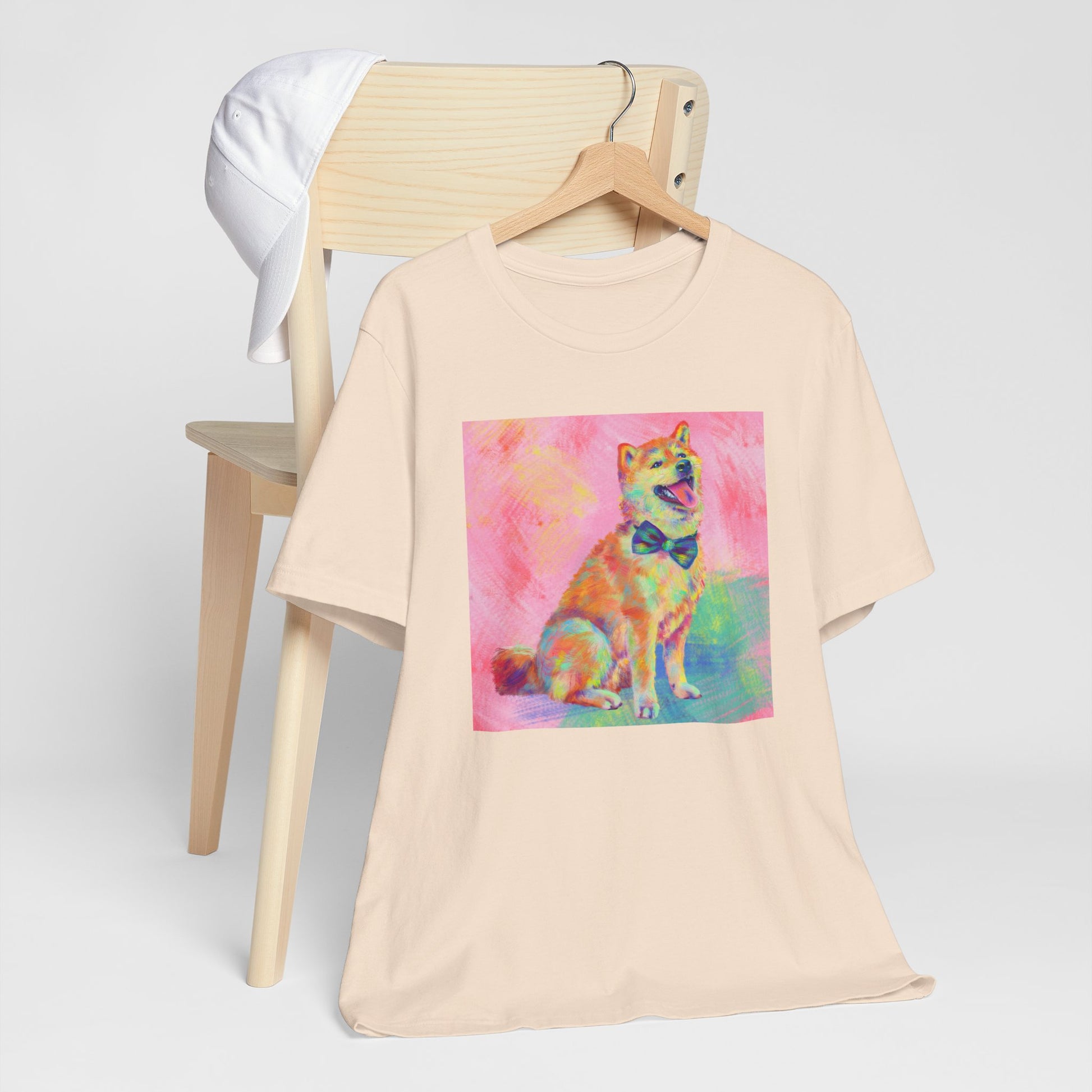 Bring some color to your day with our vibrant Shiba Inu design by Jess Castle! Featuring a hand-painted digital artwork full of neon pastels and retro pop flair, this cheerful Shiba sits proudly with a bow tie and endless good vibes. Printed in full color on a soft, high-quality tee, it’s perfect for dog and Shib lovers, art fans, and anyone who appreciates bold, happy design. A wearable artwork that pairs perfectly with your favorite jeans, streetwear fits, or cozy lounge days.