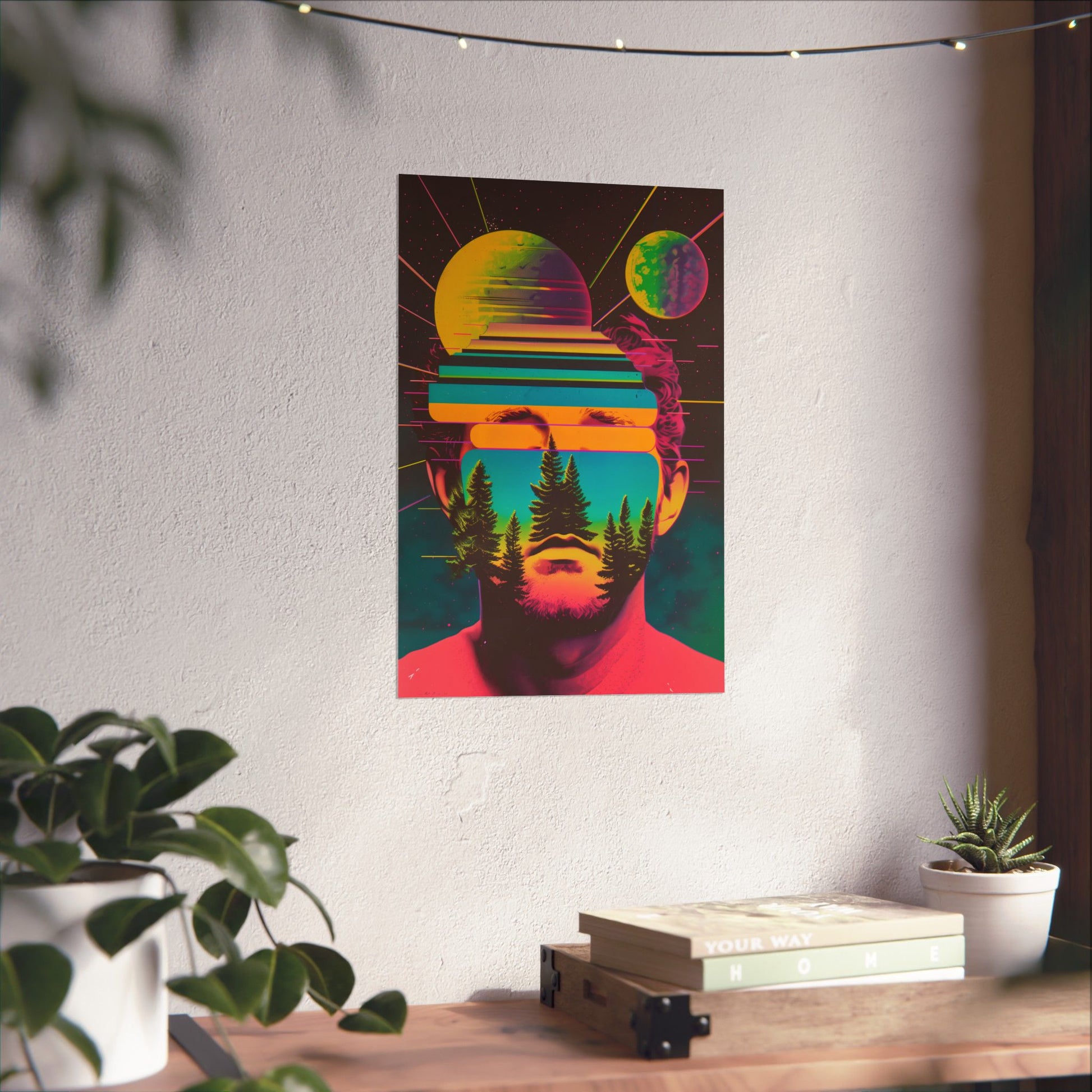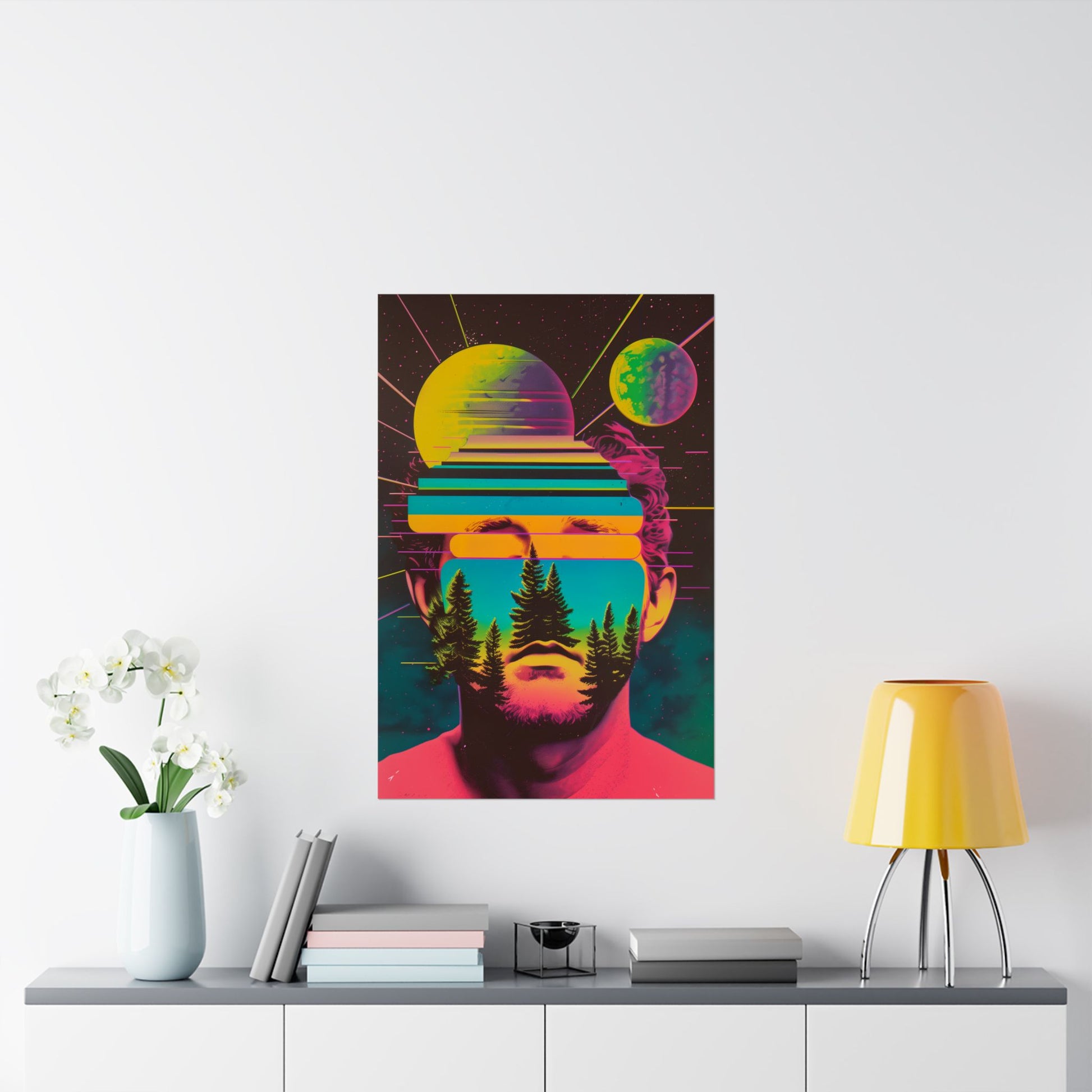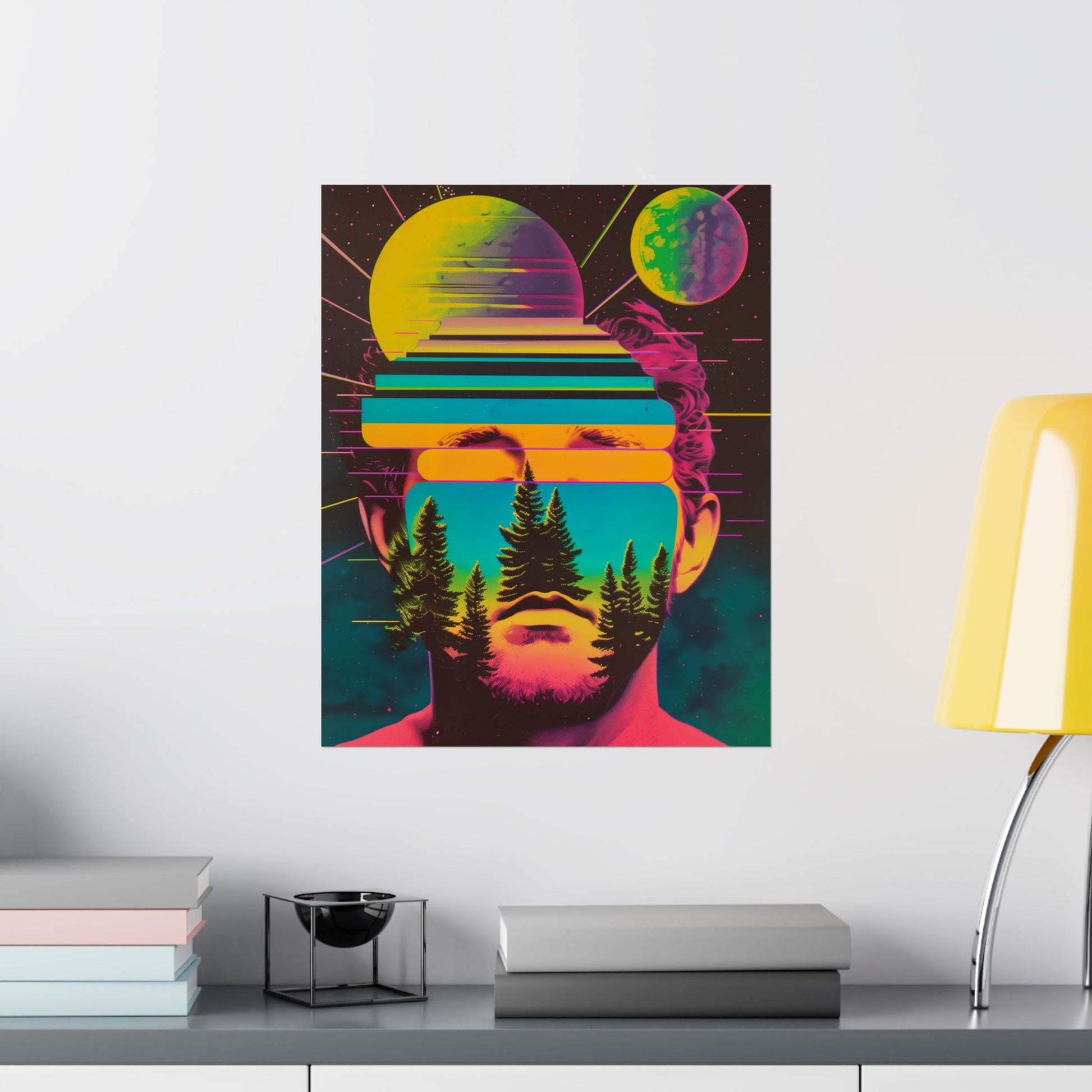 ✨ Cosmic Intentions II – Retro Psychedelic Poster Print The second release in the Cosmic Intentions series, this original digital artwork by Jess Castle fuses outer space surrealism with bold retro-futurist style. A neon-saturated portrait blends with cosmic planets, glowing gradients, and silhouetted trees, creating a trippy vision that feels straight out of an 80s sci-fi album cover. This poster makes a powerful statement piece for living rooms, studios, game rooms, or any space that thrives on cosmic energy and psychedelic art. Check out the others in the series to mix and match your posters!