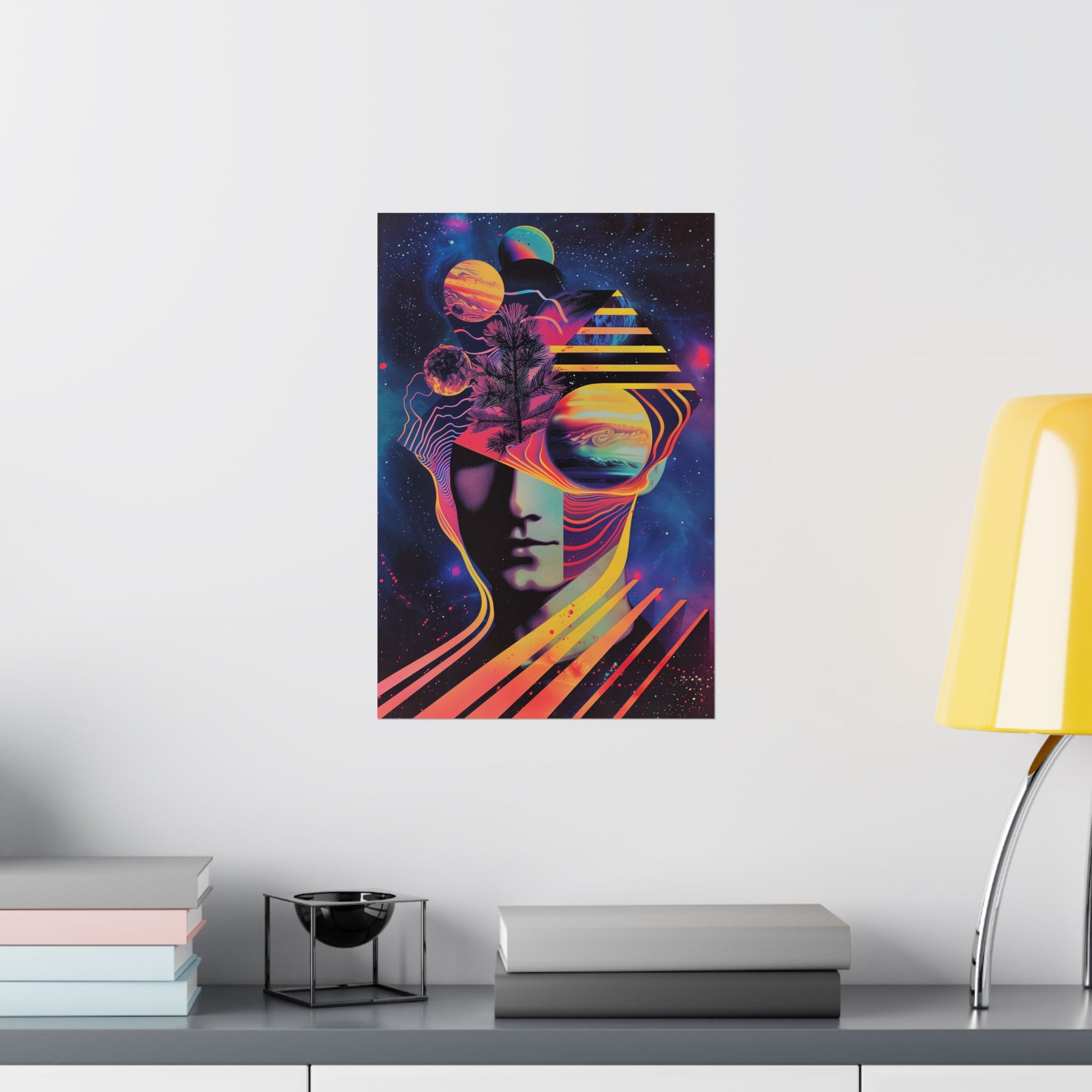 ✨ Cosmic Intentions III – Retro Psychedelic Poster Print This original outer space poster features surrealism with bold retro-futurist style. A neon-saturated portrait blends with cosmic planets, glowing gradients and trees, creating a trippy vision that feels straight out of an 80s sci-fi album cover. This poster makes a powerful statement piece for living rooms, studios, game rooms, or any space that needs some cosmic energy and psychedelic art. Check out the others in the series to mix and match your posters!