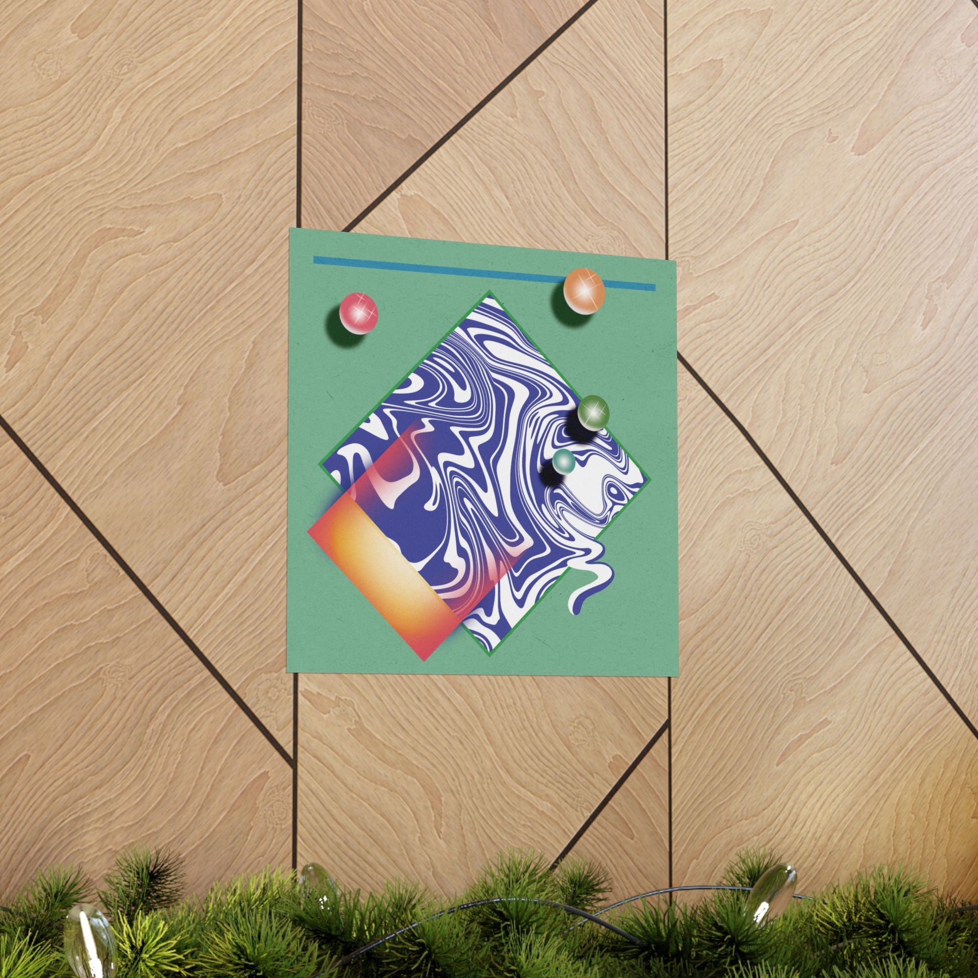 Interim – Retro Abstract Geometric Poster Interim is an original digital art print by Jess Castle, blending the dreamy energy of 80s album covers with the bold look of retro airbrush art. This square format poster combines trippy abstract patterns with bold geometric shapes, creating a vibrant statement piece for your walls. Printed in multiple sizes, it works beautifully as retro living room art, a colorful game room print, or a nostalgic pop of design in any creative space! Perfect for fans of 80s-inspired wall art, vaporwave posters, and abstract geometric decor.